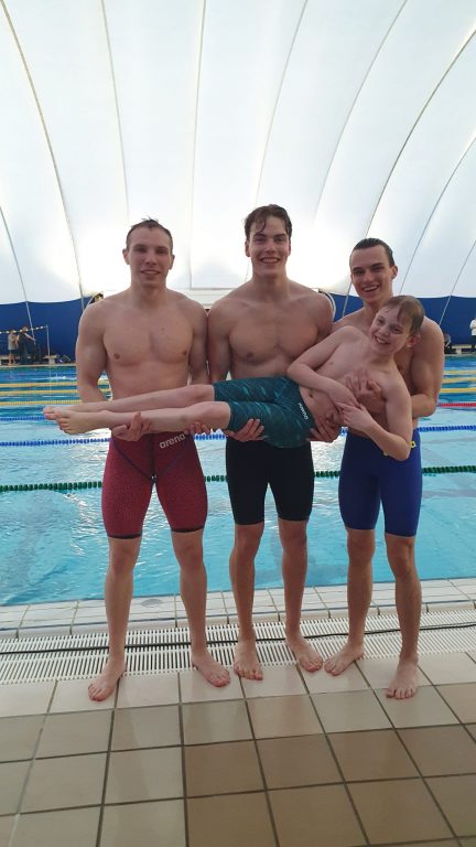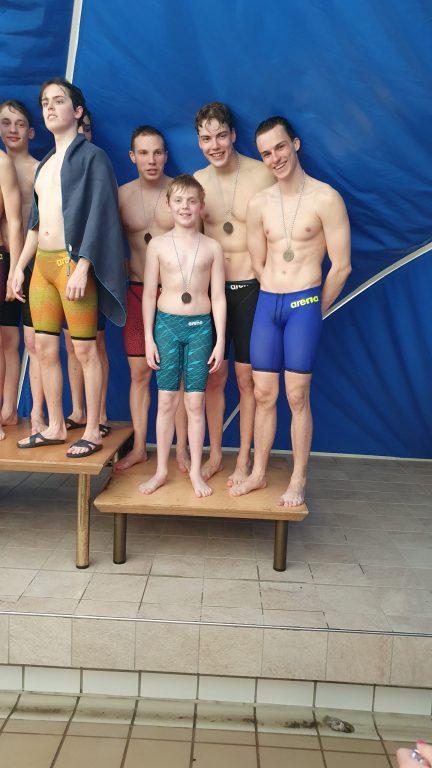 Der Sonntagabend war für die Staffelteilnehmer nicht weniger erfolgreich. Die 4x100m Lagenstaffeln waren das Highlight des Wochenendes. Die Frauenstaffel (Svea Brauch, Anna Zepp, Neele Hildebrandt, Lena Otto) bewies mit ihrer Zeit von 04:51,60, dass man auch nach einem langen Wettkampfwochenende noch super schwimmen kann und erschwamm sich verdient den dritten Platz. Die Männerstaffel tat es ihnen mit der Zeit von 04:38,20 gleich und belegte ebenfalls den dritten Platz. Allerdings mit einer kleinen Besonderheit: aufgrund des kurzfristigen Ausfalls eines Schwimmers durfte und musste Simon Sporer (Jahrgang 2011) zusammen mit den „Großen“ an den Start. Somit war für Florian Schneider, Ruben Ried und Timm Toboldt klar, so viel Vorsprung wie nur möglich für Simon herausschwimmen. Mit letzter Kraft und einem spannenden Zieleinlauf, welcher die Halle zum Beben brachte, war der Wettkampf für die Aktiven danach vorbei.