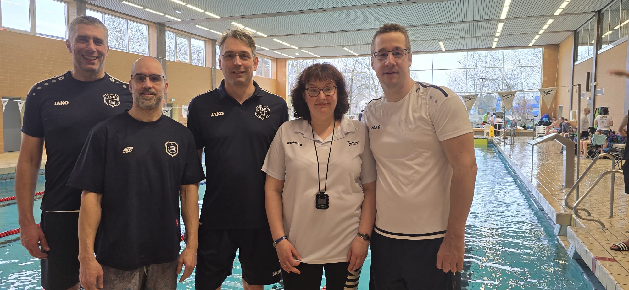 Titelbild: Die Masters-Schwimmer der TSG 1862 Weinheim in Brühl: Steffen Arta, Klaus Henrich, Claus-Jürgen Maier und Ingmar Zacharias mit ihrer Kampfrichterin Alexandra Maier