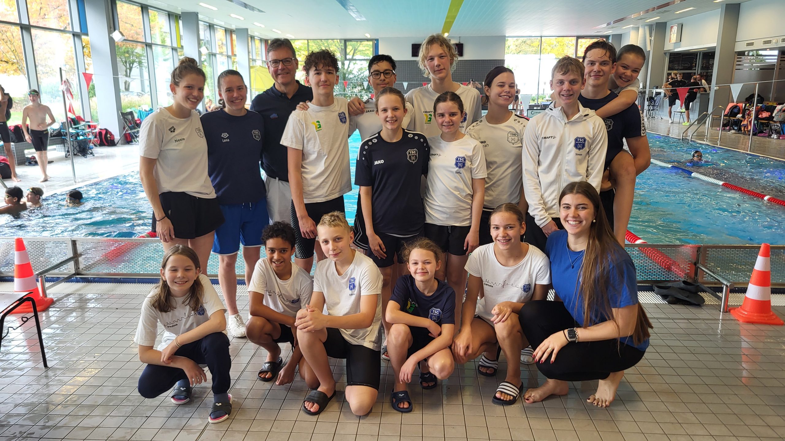 Titelbild: Ein Teil der Schwimmer*innen der TSG 1862 Weinheim mit ihren Trainern Wolfgang Schneider und Juliane Weinast