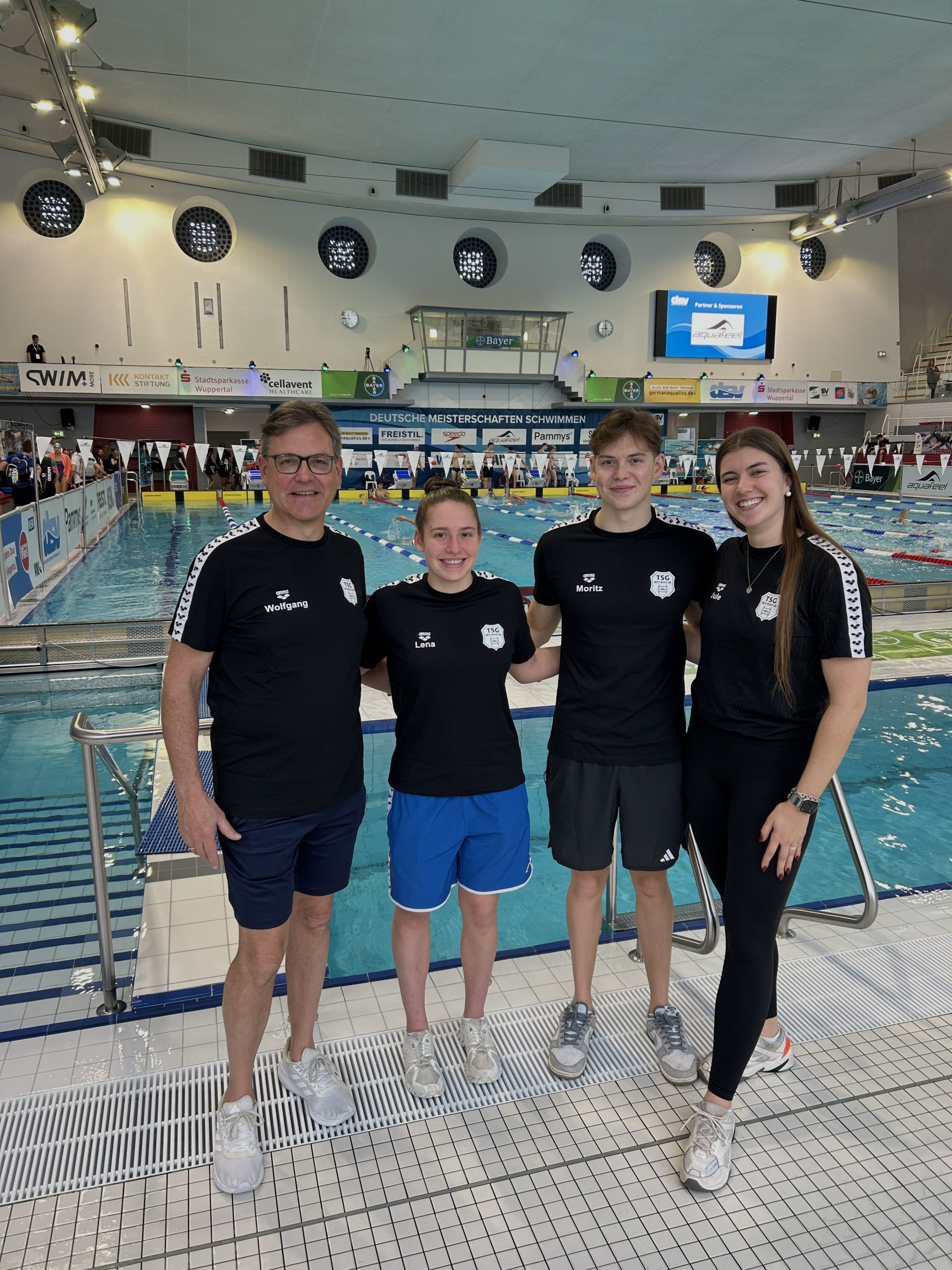 Titelbild: Lena Otto und Moritz Schneider mit Trainerin Juliane Weinast und Abteilungsleiter Wolfgang Schneider bei den DKM in Wuppertal
