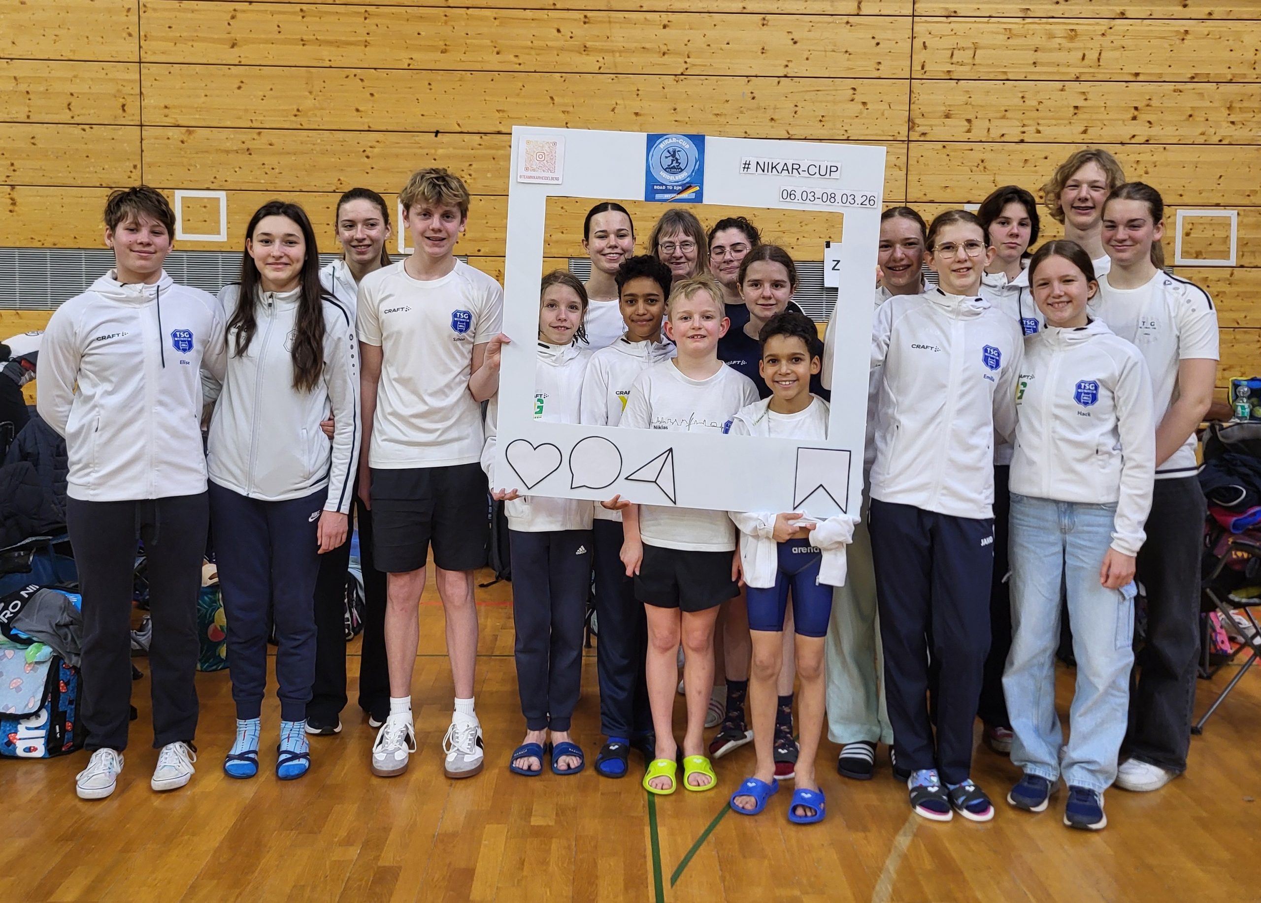 Titelbild: Ein Teil der großen Mannschaft mit ihrer Trainerin Angelika Abeln von der TSG 1862 Weinheim in Heidelberg beim Nikar Cup 2026