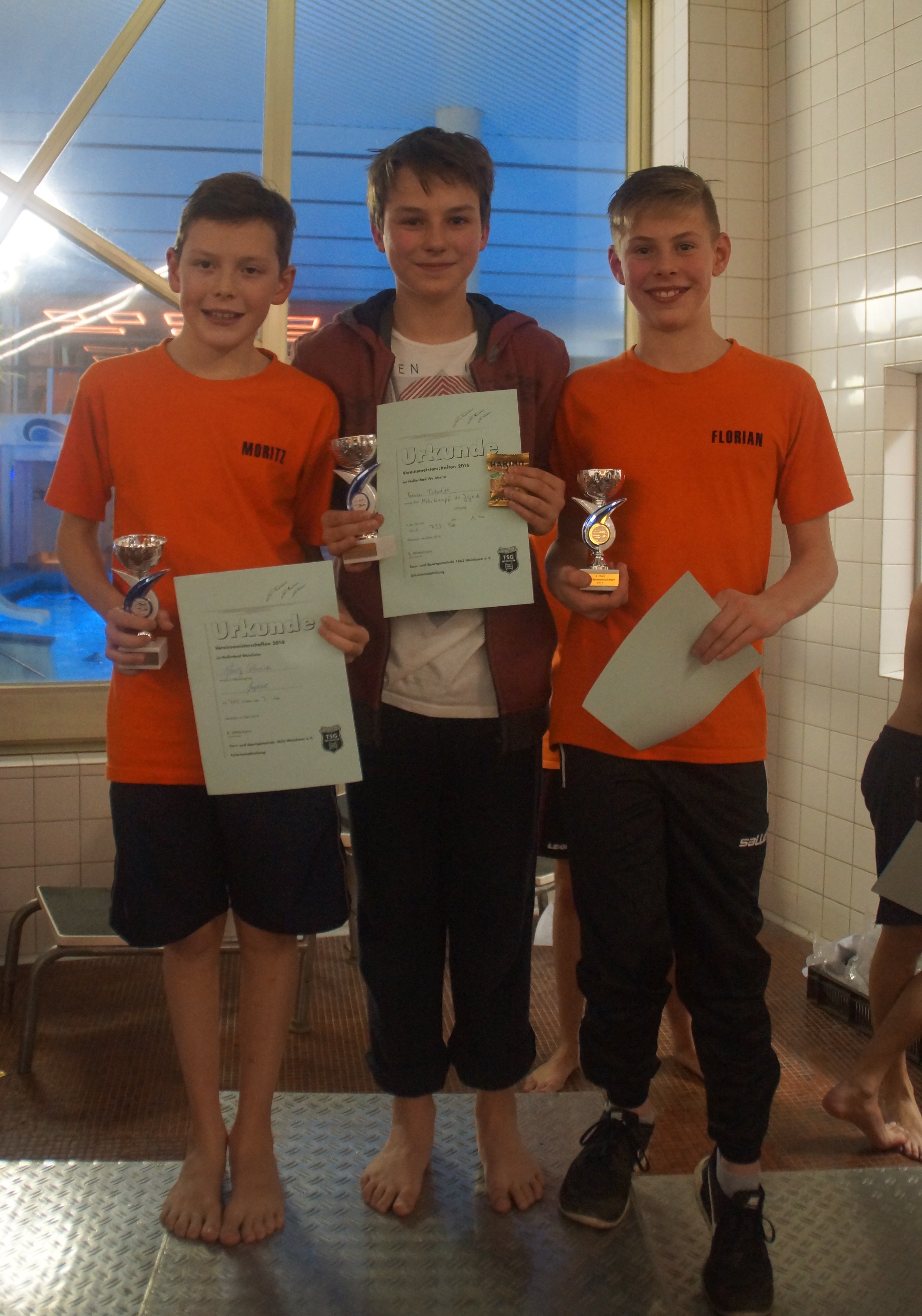 Als Gesamtsiegerin durfte sich Elisa Schütz mit 1521 Punkten auf den vier 50m-Strecken feiern lassen vor Marcela de Angelo Schmidt (1362) und Helen Klein (1290). Bei den Herren siegte Andreas Abeln (1490) knapp vor Christian Ehmsen (1478) und Ruben Ried (1267). Die junge Fabienne Raaß gewann die Jugendwertung bei den Mädchen mit 1040 Punkten vor Leonie Schmitt (987) und Rebecca Margarit-Puri (955). Bei der männlichen Jugend (unser Bild) konnten Timm Toboldt (739), Moritz Schneider (715) und Florian Zaplatilek (709) die Pokale entgegennehmen. Sehr gut war auch die Beteiligung bei den Familienstaffeln, wo die Familie Schneider vor den Familien Abeln und Schüßler und weiteren 11 Teilnehmern die schnellsten waren.