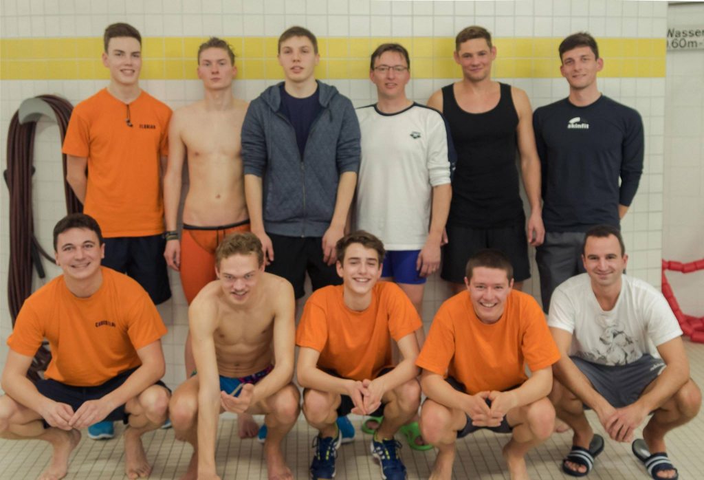 13 Schwimmstrecken mussten je zweimal von allen Mannschaften belegt werden, und so war für jeden etwas dabei. Einen schönen Trainingstag unter Wettkampfbedingungen gönnte sich Florian Angert als erfolgreicher Triathlet und ehemaliger Topschwimmer. Bei seinen vier Einsätzen glänzte er besonders mit Superzeiten über 200m Freistil (1:56,9 min.), 400m Freistil (4:10,9 min. und 1500m Freistil (16:34,3 min.). Die Spitzenzeiten von Frank Bähr sind zwar schon 30 Jahre her, aber mit seinen 1:15,3 min. über 100m Brust konnte er der Mannschaft sehr gut helfen. Kurzfristig reaktiviert wurde auch Felix Swiczinsky mit schnellen 26,5 sek. über 50m Freistil und ebenso Uwe Henrich, der zweimal erfolgreich (100m Rücken in 1:09,2 min.) im Einsatz war. Ein weiterer Joker wurde mit Julius Ott gesetzt, der mit 2:59,0 min. über 200m Brust gut aushalf.
