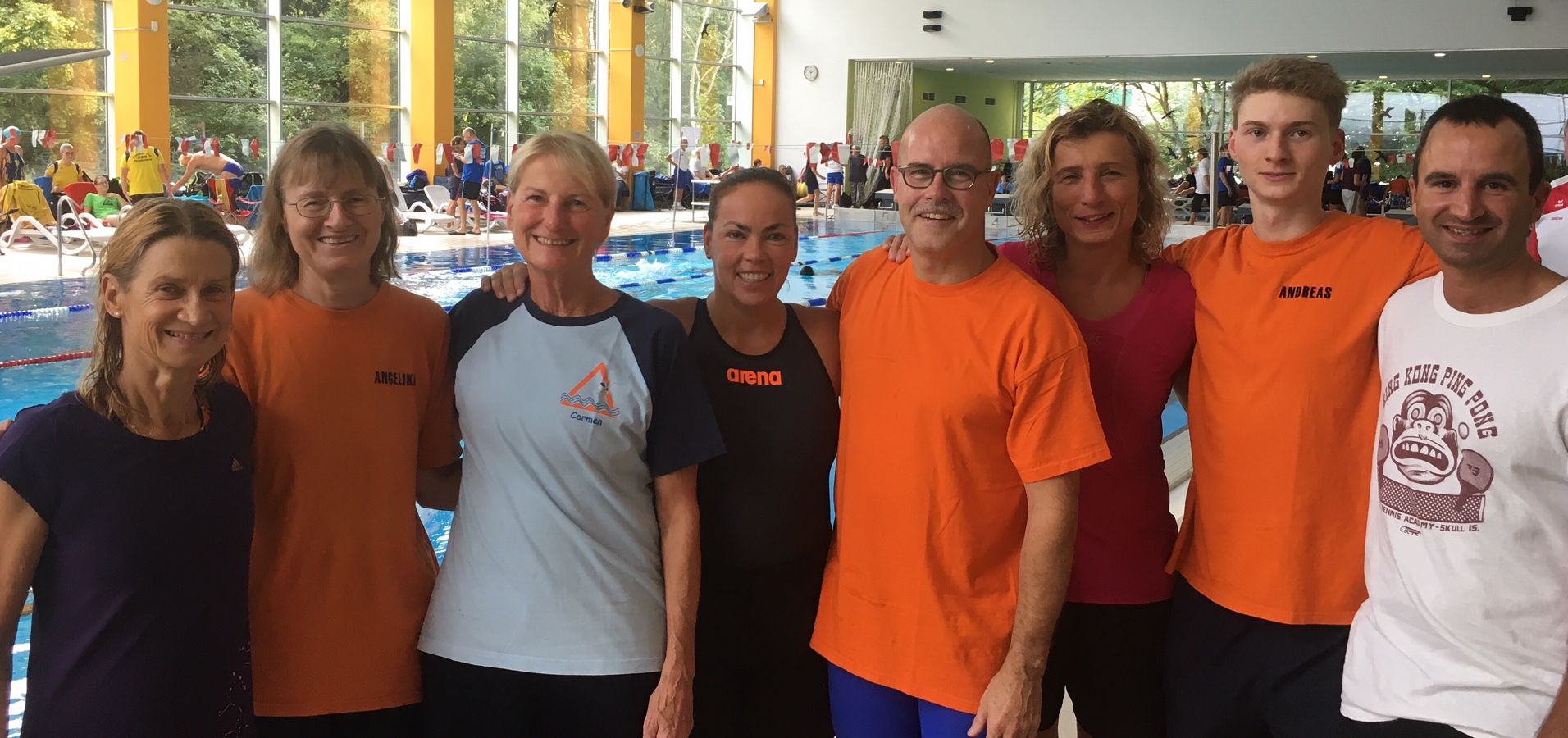 (Leimen) Neun Aktive aus der Weinheimer Mastergruppe waren am Wochenende in Leimen bei den Baden-Württembergischen Landesmeisterschaften am Start. Der Wettkampf gesteltete sich überaus erfolgreich, gekrönt durch zwei Deutsche Altersklassenrekorde von Renate Swiczinsky-Kordes in der AK 60 über 50m Rücken (37,87 sek.) und 200m Rücken (3:01,37 min.). Die Weinheimer Masterschwimmer konnten 24 erste und 9 zweite Plätze erringen und gehörten zu den erfolgreichsten Teams. Neben ihren zwei Rekorden siegte Renate Swiczinsky-Kordes noch über 100m und 200m Freistil, 100m Lagen und 100m Rücken. Erfreulich waren für die Weinheimer Schwimmer auch noch drei erste Plätze und einmal Rang 2 in den Frauen- und Mixed-Mannschaften über 4x50m Freistil und 4x50m Lagen.