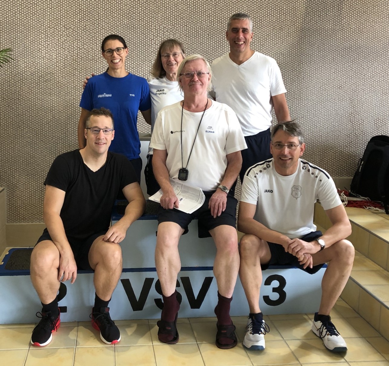 Titelbild: Die Masterschwimmer*innen der TSG 1862 Weinheim: Ingmar Zacharias, Agnès Riatti, Angelika Abeln, Elmar Abeln, Steffen Arta und Claus Maier (von links) im Viernheimer Hallenbad.
