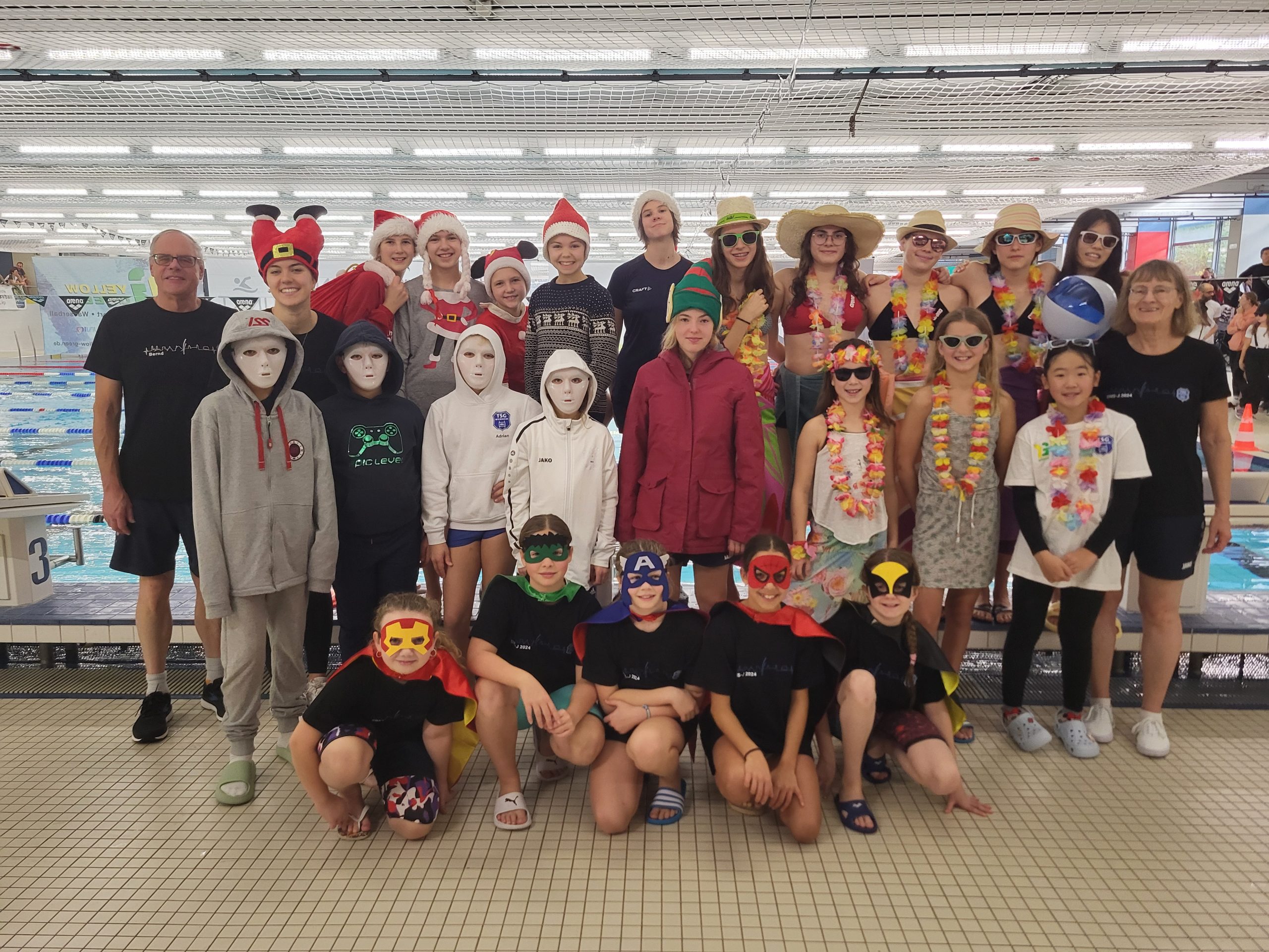 Höhepunkt dieser Veranstaltung war dann die Siegerehrung am Ende des 2. Wettkampf-Tages aller Mannschaften mit dem traditionellen Verkleiden der einzelnen Teams. Hierbei wurde jedes Team einzeln aufgerufen und durfte unter musikalischer Begleitung und tosendem Applaus der Zuschauer und Vereinskollegen*innen zur Siegerehrung einlaufen. Der Weinheimer Frauenpower zeigte sich als Hawai-Ladies mit ihren Super-Heldinnen und weiblichen Nikoläusen, die Jungs traten mit weißen venezianischen Gesichtsmasken auf.